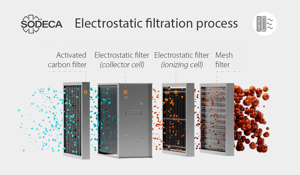 The filtration process is based on the ionization of contaminant particles through a high-voltage electric field. These charged particles are then attracted to a collector cell, where they are retained, allowing much cleaner air to be discharged outdoors.